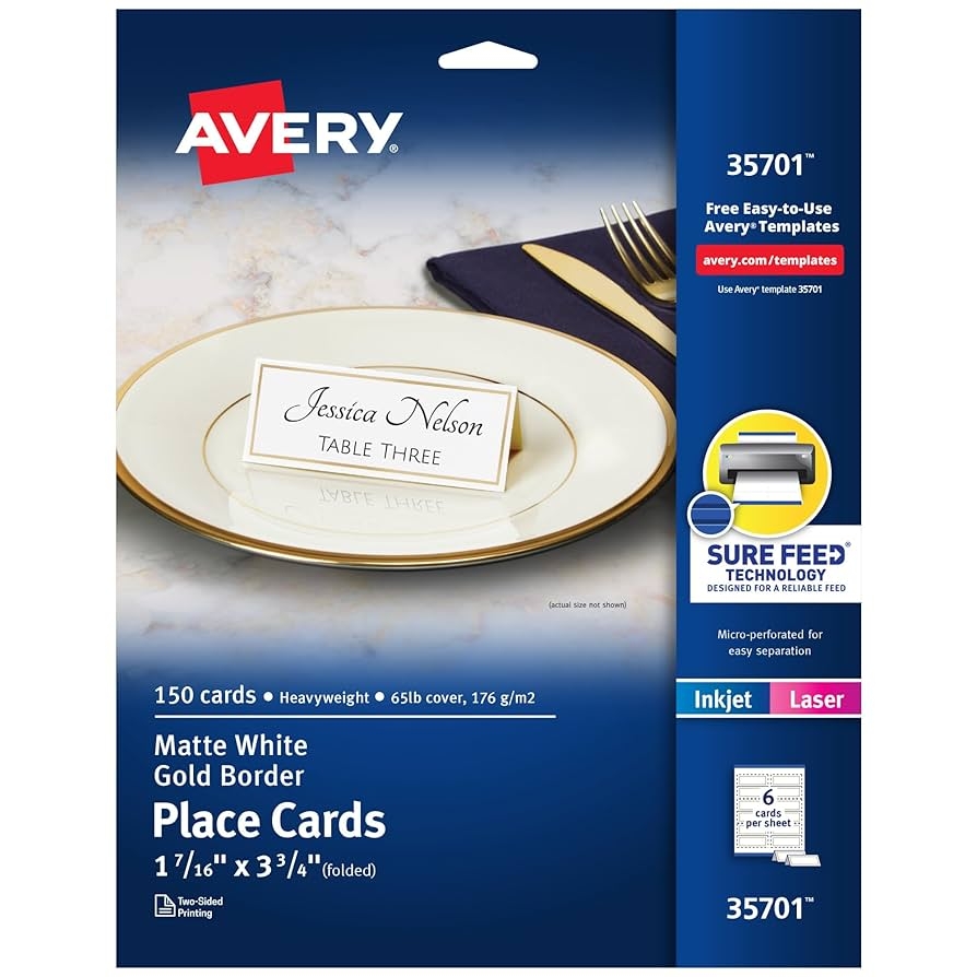 Amazon Avery Printable Place Cards With Sure Feed Technology 1 7 16 X 3 3 4 White With Gold Border 150 Blank Tent Cards For Laser Or Inkjet Printers 35701 Office Products