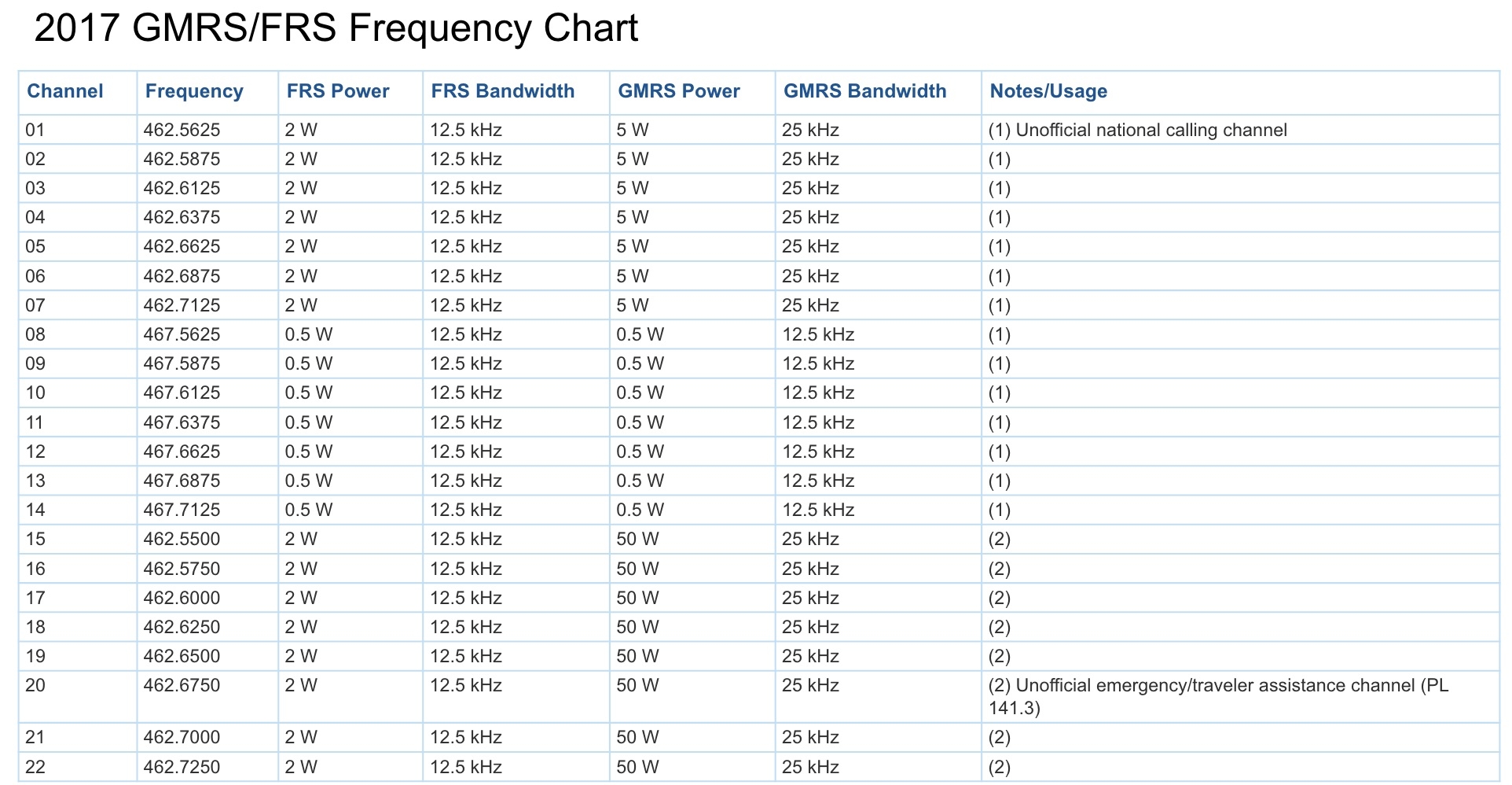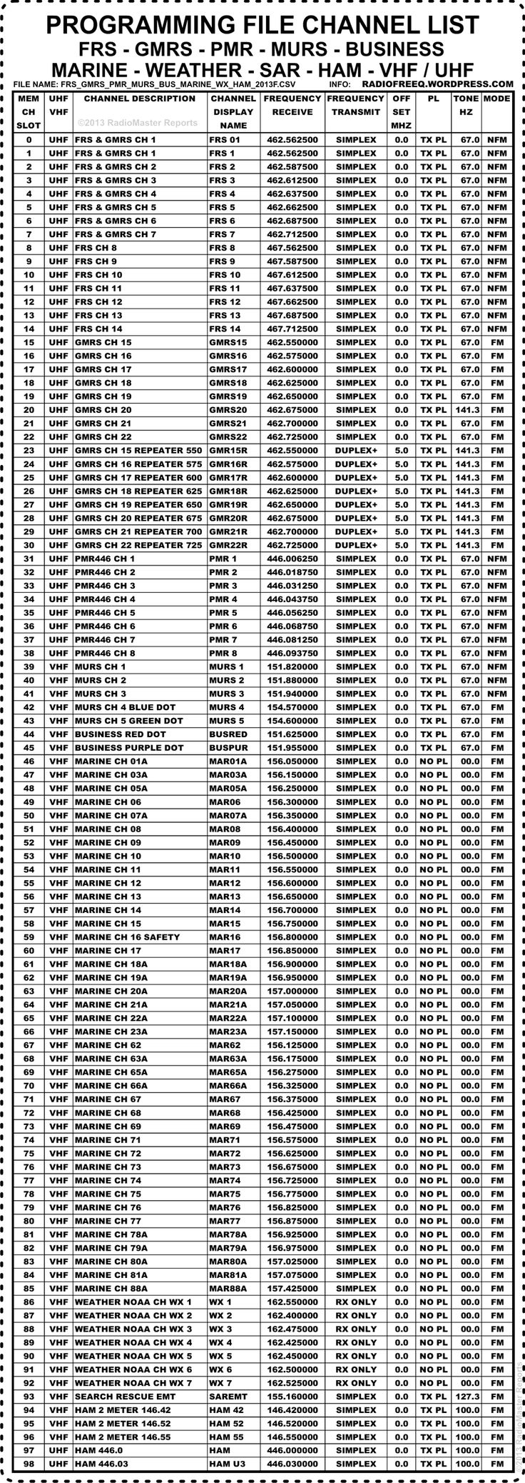 printable gmrs frequency chart