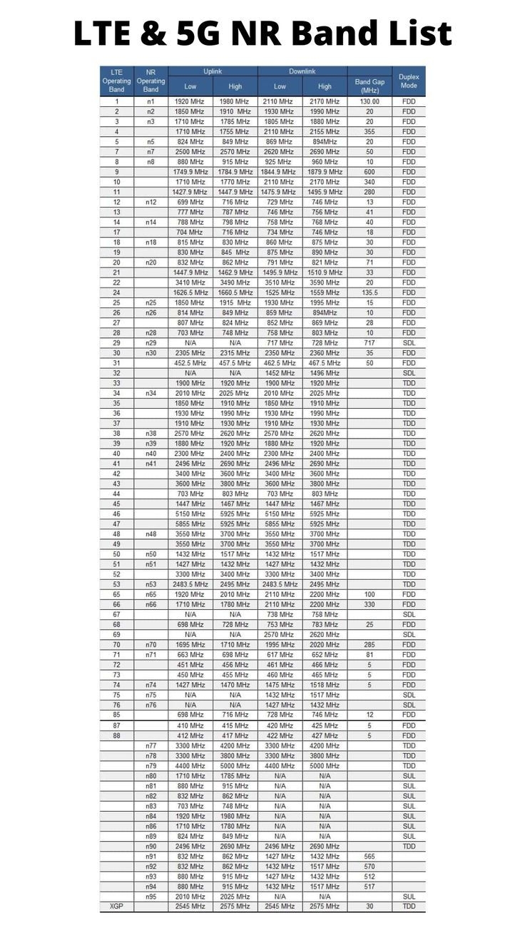 LTE And 5G NR Band List