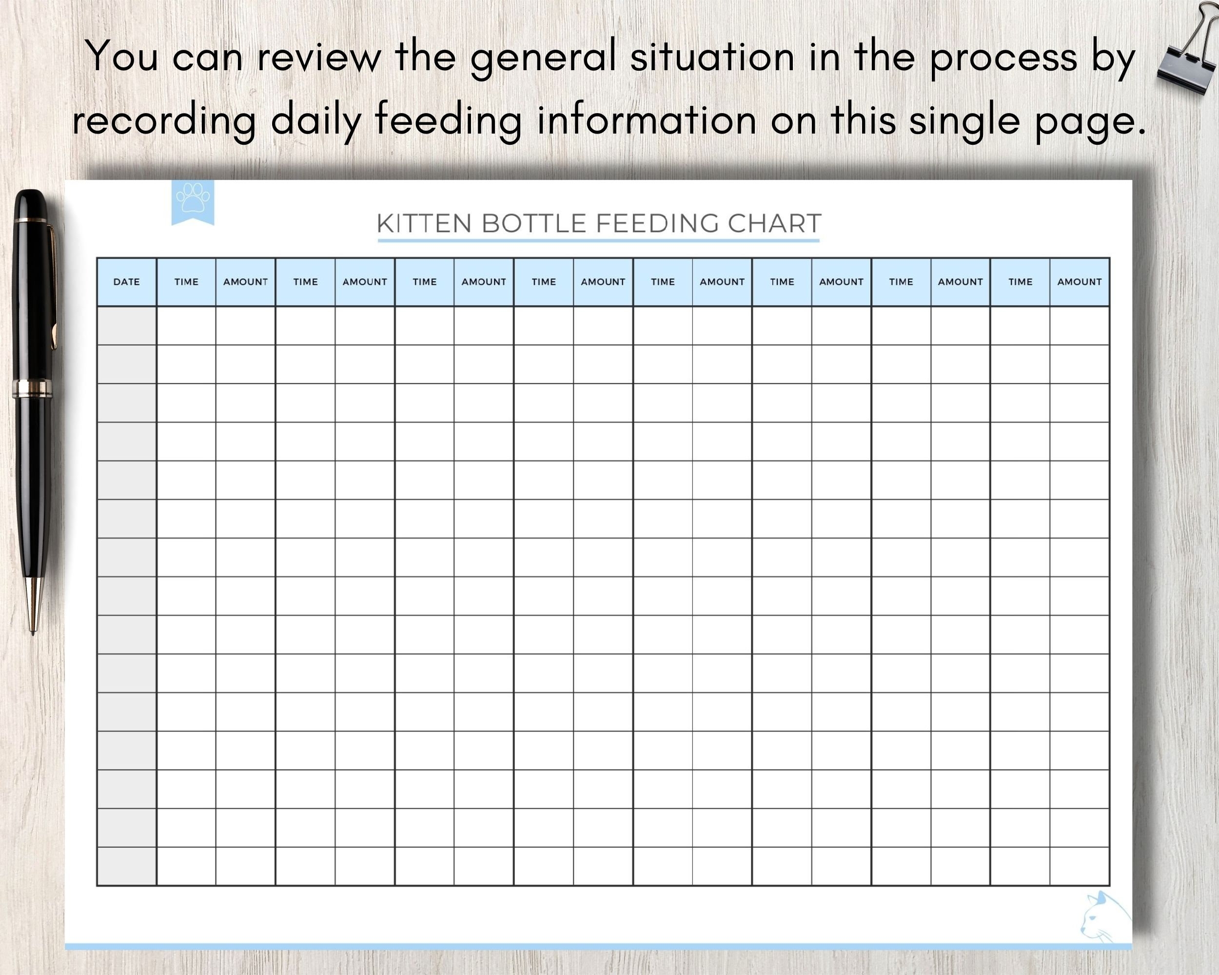 Simply download and print our kitten feeding chart, then fill in the details of each feeding session. This will help you track when and what your kitten eats, making it easier to spot any changes in their appetite or behavior. Consistency is key when it comes to feeding your kitten, and our chart will help you stay on top of their feeding schedule.